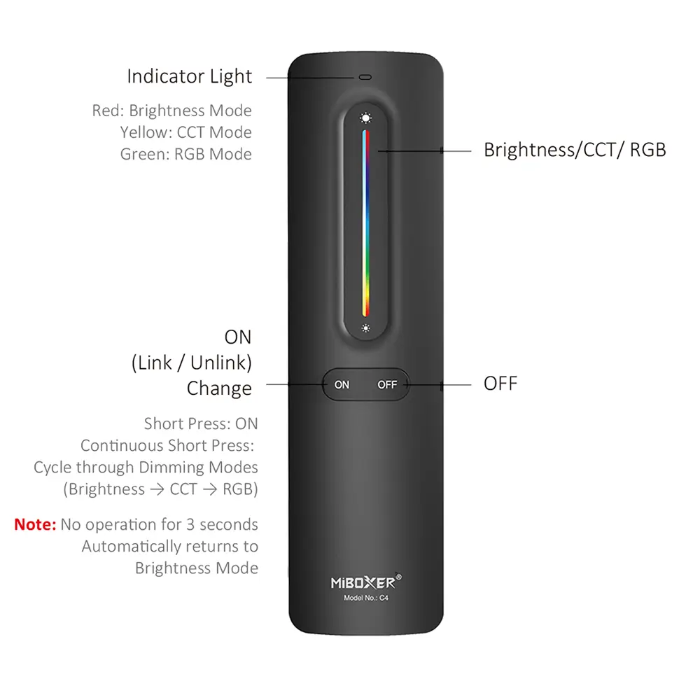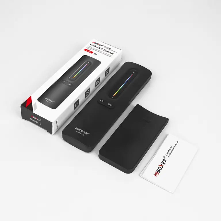 Die MiBoxer C4 ist eine moderne, mobile Version des MI-LIGHT B0 RGB+CCT-Wandpanels in Form einer Fernbedienung. Das Hauptmerkmal dieses Modells ist die Unterstützung nur einer einzigen Beleuchtungszone. Wie bei anderen Geräten der MiLight/MiBoxer 2.4G-Serie arbeitet die Fernbedienung in einem Umkreis von bis zu 30 Metern und steuert eine unbegrenzte Anzahl von Empfängern, die jedoch alle als eine gemeinsame Gruppe reagieren. Die Fernbedienung ermöglicht die Einstellung der Helligkeit, der Farbtemperatur (CCT) sowie des gesamten RGB-Farbspektrums, sodass Sie ganz einfach die gewünschte Atmosphäre und eine komfortable Lichtszene schaffen können.
