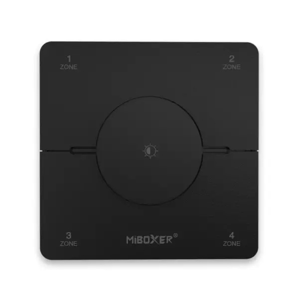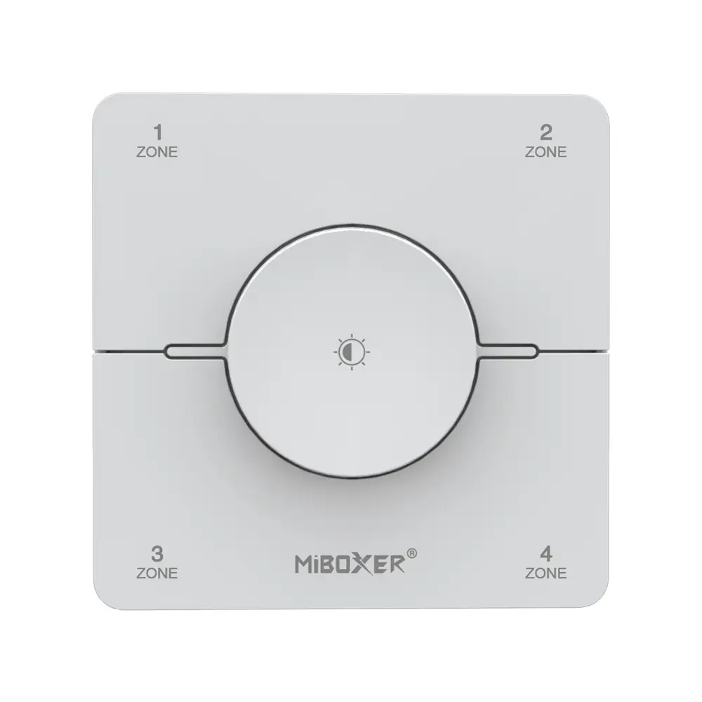The MI-LIGHT K0S is a modern LED control panel with a rotating dial, designed for precise control of CCT lighting (adjustable color temperature) across up to four independent zones. This wall-mounted device is ideal for advanced LED lighting systems in residential spaces, offices, and commercial interiors where comfort, aesthetics, and smart functionality are essential.
