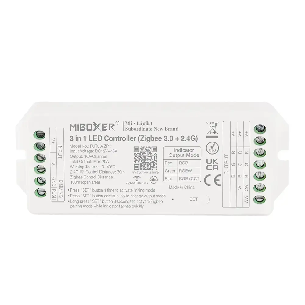 The FUT035ZP+ controller is an advanced device used to control MONO / CCT LED lighting using Zigbee 3.0 technology. This versatile controller supports a voltage range of 12V to 48V, allowing for powering lighting with different power requirements. The current rating is up to 20A, enabling the control of even large lighting systems. The FUT035ZP+ controller can manage a maximum lighting power of 240W, 480W, 720W, or 960W, depending on the needs. With these parameters, this controller provides advanced control and flexibility for various lighting projects.